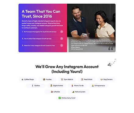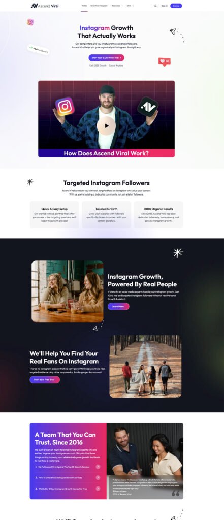 Ascend Viral is a results-driven Instagram growth agency that helps clients gain real, targeted followers through ethical and organic strategies. The goal of this website was to clearly communicate their unique approach—focusing on human-powered growth assistants rather than bots or automation—and to drive conversions through trust, transparency, and a streamlined user experience.