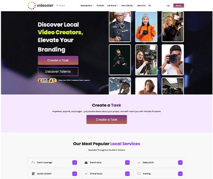 Crafted messaging that highlights value: “rapid hiring”, “escrow protection”, “curated portfolios”, and “local talent” — all working to build trust and ease decision-making Videoster.ca.